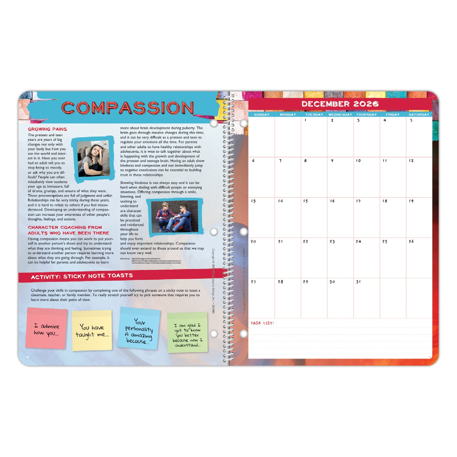 2026-2027 “Plan Better. Live Boldly.” This planner is geared towards grades 5-8 and is for intermediate and middle schools striving to make a positive difference in their students! This planner features a bold and playful design geared towards SOCIAL AND EMOTIONAL LEARNING. It introduces students to valuable character traits and encourages the development of good character. Along with engaging monthly content, the weekly THINK, FEEL, and ACT sections encourage students to SELF-EVALUATE THEIR CHARACTER and implement it in their daily lives. There are also weekly prompts to check in on how well they are integrating these GOOD CHARACTER LESSONS.