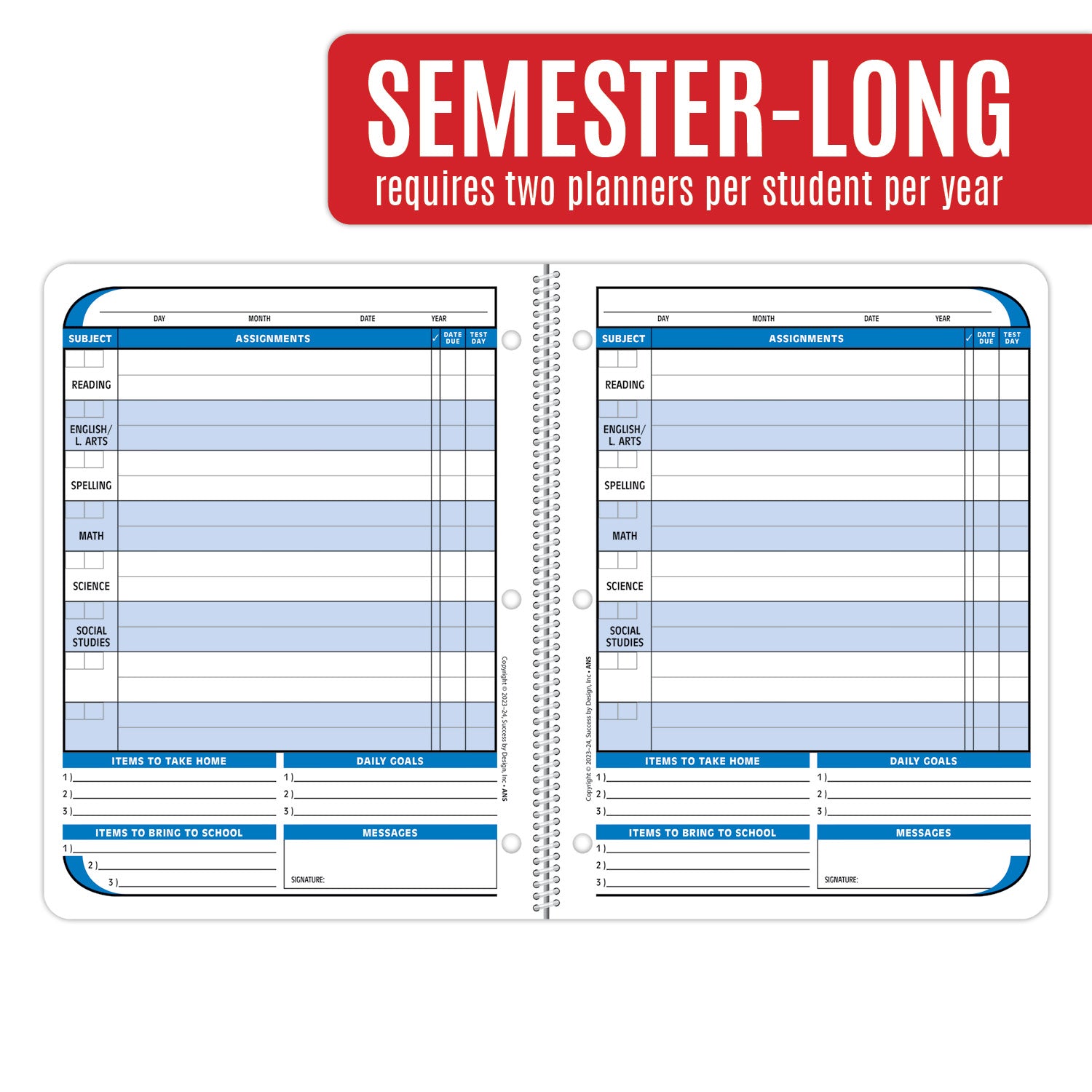 The semester-long planner includes 112 pages with a clear, easy-to-use layout. Measuring 8 ¼ inch x 10 ¾ inch, it's large enough for students to write comfortably but compact enough to fit in a backpack. The undated format allows flexibility, making it suitable for any school calendar. Each page is structured for six core subjects — Reading, English/Language Arts, Spelling, Math, Science, and Social Studies — so students never miss an assignment.